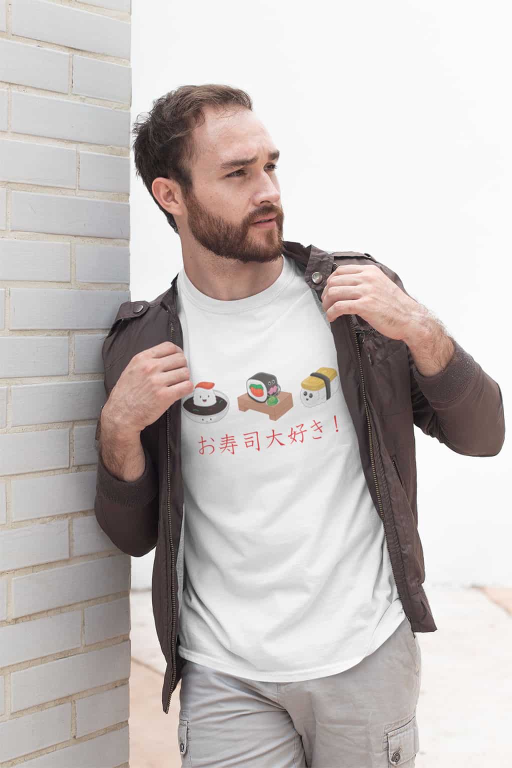 Have a little fun with this Japanese “お寿司大好き!” (Osushi daisuki!) design that means “I love sushi!” These cute characters are a fun way to express your love of sushi.